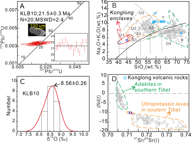 针对上述问题,中国科学院广州地球化学研究所同位素地球化学国家重点实验室岩石学学科组郝露露博士(现为中国科学技术大学博士后)、王强研究员及其合作者以拉萨地块中部孔隆乡粗面岩中新发现的镁铁质岩浆岩包体为研究对象(图1),进行了系统的SIMS锆石U-Pb年龄和O同位素、全岩主-微量化学和Sr-Nd-Pb同位素、矿物的主微-量元素、以及原位的单斜辉石Sr同位素等研究,揭示出这些包体具有如下重要特征:(1)包体的主要矿物组成(单斜辉石、金云母和透长石)与超钾质岩类似,而且是岩浆斑晶,不是地幔捕掳晶;(2)相对于后碰撞超钾质岩,包体具有类似的形成年龄(中新世:21.5 Ma)(图2A)和微量元素特征,但具有更低的SiO2含量和略微较少富集的Sr-Nd同位素组成,其岩浆锆石具有富集的O同位素组成(平均δ18O 是8.56 ± 0.26‰)(图2B-D);(3)包体的单斜辉石具有相对一致的Sr同位素组成(87Sr/86Sr = 0.709–0.714),与高Mg#单斜辉石平衡的熔体具有比包体全岩稍微低的微量元素含量(图3)。